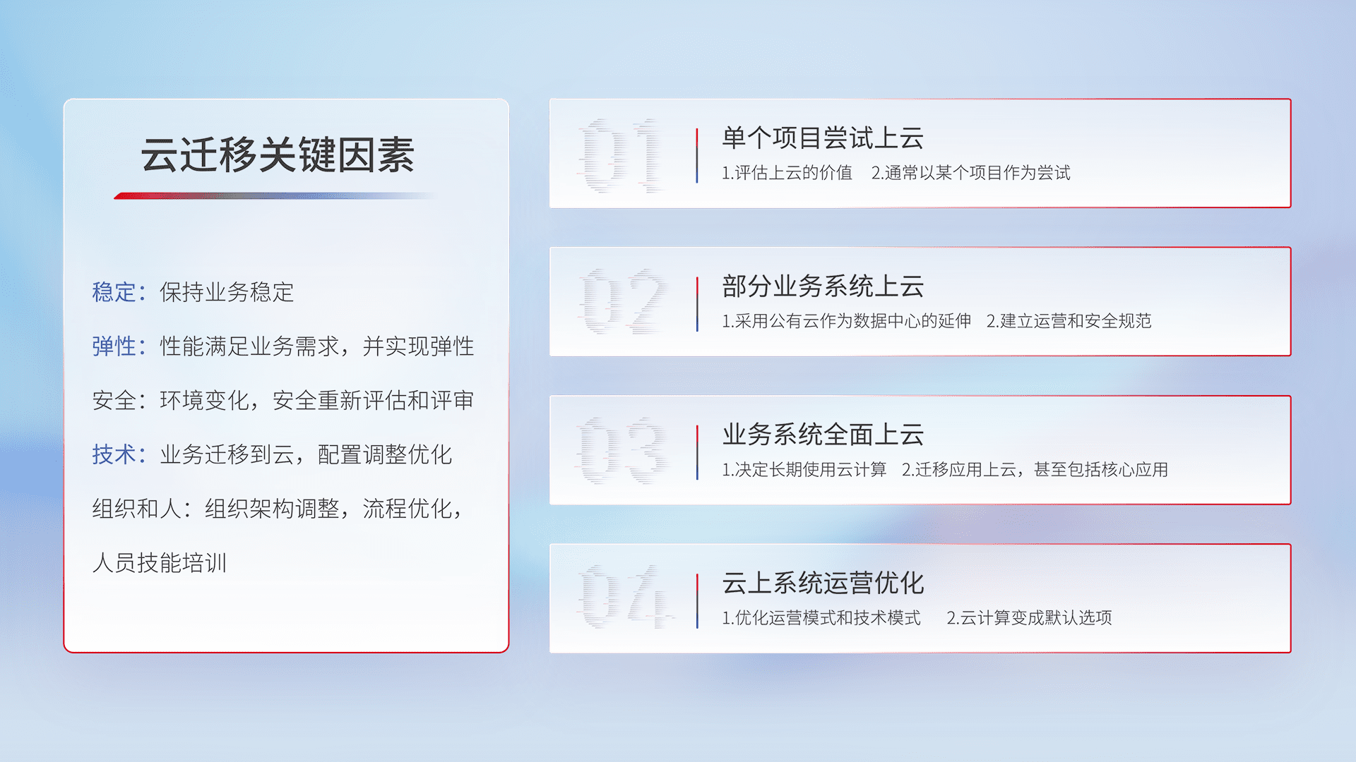 结合实际业务,,,,从规划设计、、、云平台选型、、、云原生改造、、、数据迁移、、、集成交付,,,迁移全过程为客户识别最佳上云路径,,,,做好风险识别管理,,,设计网络架构、、、、身份权限、、、、安全审计合规、、操作审计、、、、日志审计、、、、监控告警策略、、、多站点容灾设计等,,,,对云上基础设施进行整体规划,,,,提升IT治理水平,,,,以满足弹性、、、、高可用、、高性能的需求。。。。