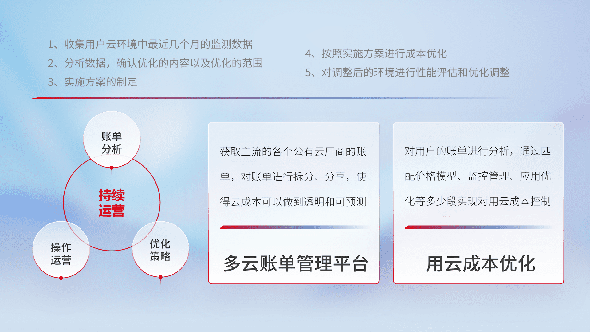 通过多云纳管,,,以统一的资源数据模型把客户的云资源进行抽象和封装,,进而实现对多云资源的统一操作,,,保障云资源管理的可靠性、、、、稳定性与可用性。。。。量身定制化运维内容,,,,配置、、、、开发运维、、、补丁管理、、、备份、、、、监控、、认证和访问管理、、、审计和日常巡检等,,,,保障在用云过程中的可靠度,,,稳定度以及高可用率。。